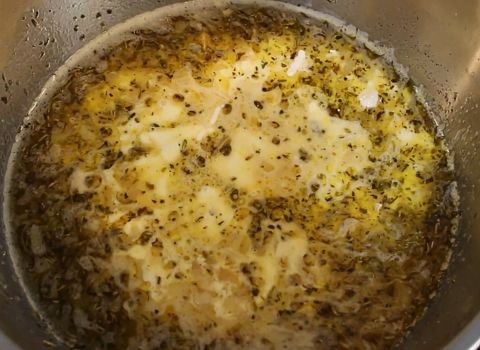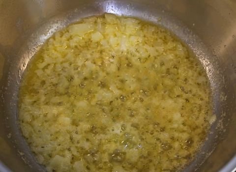 - Heat a medium saucepan over medium-high heat. Add butter, chopped onion, and minced garlic. Let them cook for one minute so they soften and release aroma. Stir often so nothing burns.