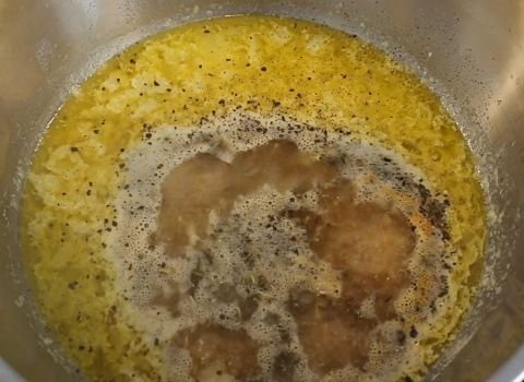 - Pour in chicken stock and Worcestershire sauce. Add lemon juice, thyme, basil, black pepper, cayenne, and salt. Stir well to bring all flavors together. Let the mix cook for about three minutes so the spices bloom and the liquid warms through.