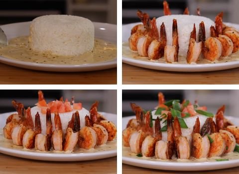 - Scoop a cup of warm cooked rice onto a plate. Spoon the warm sauce around the rice. Lay the shrimp on top. Add more sauce as needed. Sprinkle diced tomato and sliced green onion over the plate. Serve right away while everything is hot.