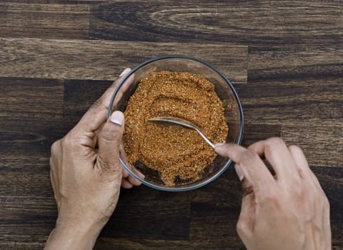 Use a spoon or small whisk to stir the spices. Move the spoon around the bowl in small circles. Break up any tiny lumps from the sugar or herbs. Keep stirring until the whole bowl shows one solid color. A smooth blend means the seasoning will spread well on chicken.