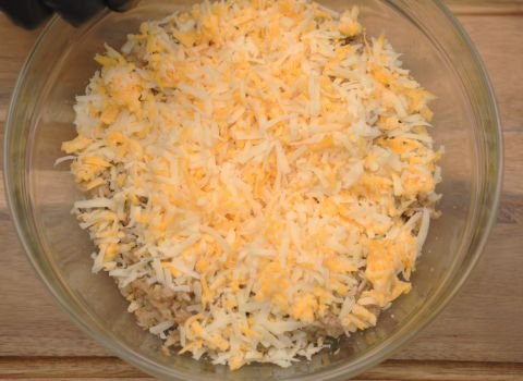Grate the Colby Jack and mozzarella cheese, then mix them into the boudin until everything blends together. The cheese should melt slightly into the warm sausage, creating a creamy filling.
