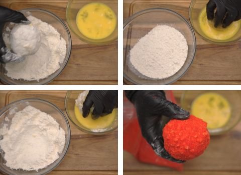 Take each chilled boudin ball and coat it first in flour, then dip it in the egg wash, and finally roll it in the crushed Cheetos. Make sure every side is well covered.