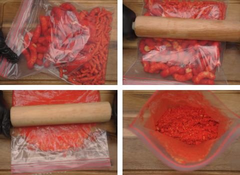 - In a Ziplock bag, add half a bag of Flamin’ Hot Cheetos and half a bag of Hot Cheetos Puffs. Crush them until fine. You can use a rolling pin or food processor for this.