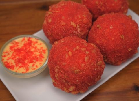 Now, by adding crushed Hot Cheetos to the coating, we take the traditional recipe to a whole new level. These Hot Cheeto Boudin Balls bring heat, crunch, and a pop of bright red color that makes every bite exciting.