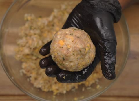 Take a scoop of the mixture and roll it between your hands into a ball, about the size of a golf ball. Place each one on a plate or tray.