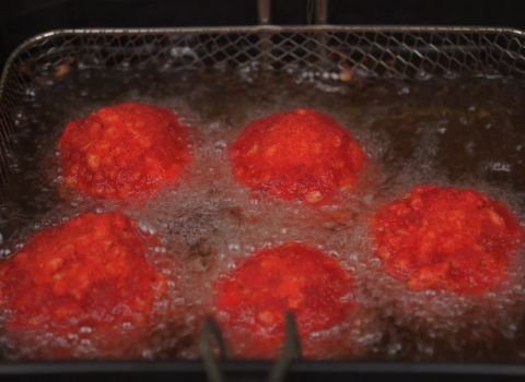 - Heat oil in your frying pan or deep fryer to about 350°F. Fry the boudin balls for 3 to 4 minutes per side, or until bright red and crispy.