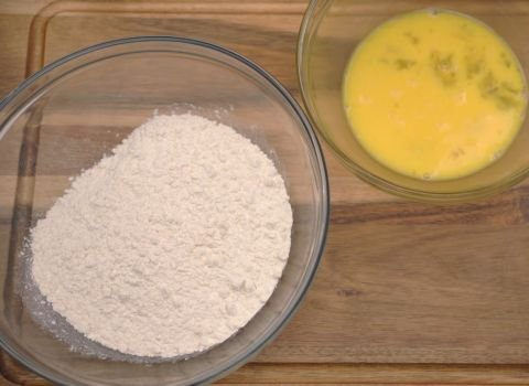 - In one bowl, whisk the eggs. In another, pour the flour. In a third, add the crushed Cheetos.
