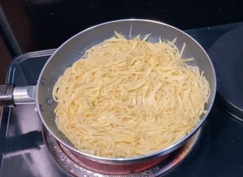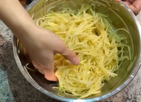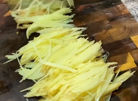 Peel the potatoes and use a mandolin slicer to cut them into thin, even slices. Then, slice them into fine matchsticks (julienne style). This helps them cook evenly and gives that perfect crisp edge.