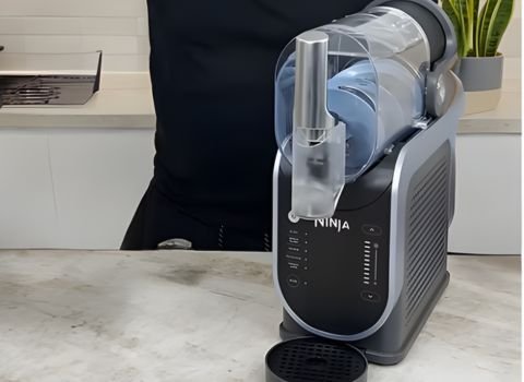 First, make sure your Ninja Slushi machine is clean and set up on a flat counter. Slide the condensation catch into the grooves under the evaporator. Then, put the auger over the evaporator and twist it until it clicks. Slide the vessel over the auger, push the bail handle back to lock it, and pop the drip tray in front. Plug it in, and you’re good to go!