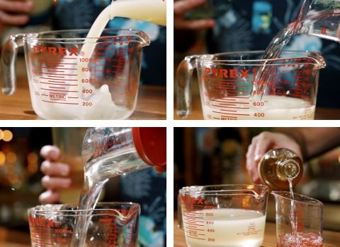 Then, I measure out 8 ounces of white rum, 4 ounces of simple syrup, and 24 ounces of water. Having everything ready makes it quick and easy.