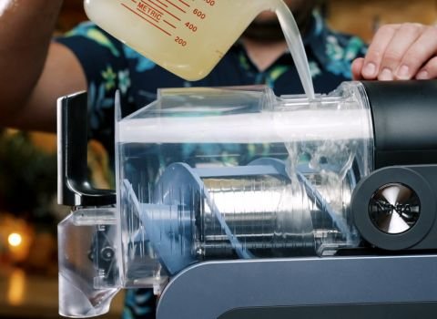 I select the “SPIKED SLUSH” preset on the machine. This setting is made for drinks with alcohol, so it gets the texture just right.