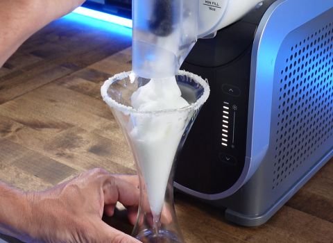 Once your margarita has reached the perfect slushie texture, place a glass under the dispenser and slowly pull the handle to pour the drink.