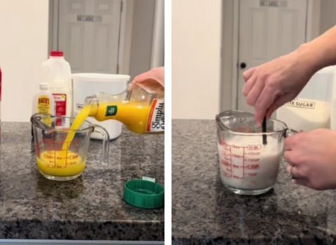 In a large measuring cup or bowl, pour in 2 cups of orange juice and 1 cup of almond milk. Add 1/2 teaspoon of vanilla extract and 1 tablespoon of sweetened condensed milk.