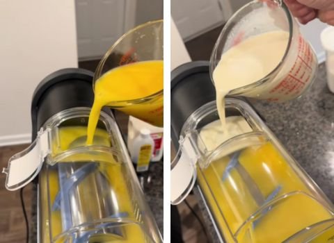 In a large measuring cup or bowl, pour in 2 cups of orange juice and 1 cup of almond milk. Add 1/2 teaspoon of vanilla extract and 1 tablespoon of sweetened condensed milk. Stir it all together with a spoon or whisk until it’s well combined. I like to give it a good mix to make sure the sweetened condensed milk isn’t clumpy.