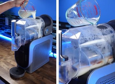 Plug in the machine and make sure it’s on a flat surface. Check that the condensation catch is under the evaporator and the auger is slid into place. Slide the vessel over the auger, push the bail handle back to lock it, and pop the drip tray in front. The manual says to let the machine sit upright for 2 hours before first use, so plan ahead if it’s brand new.