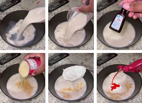 2. In a large mixing bowl, add milk, vanilla extract, sweetened condensed milk, Cool Whip, and strawberry syrup.