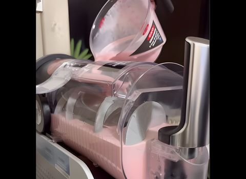 Open the lid on top of the Ninja Slushi machine. Carefully pour the mixture inside. Close the lid tightly.
