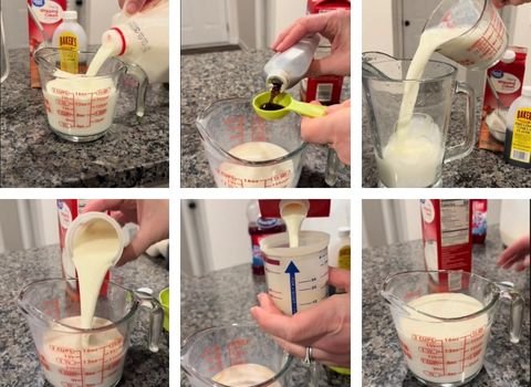 Grab your whole milk, heavy cream, sugar, and vanilla extract. Measure them out 2 cups milk, 1/2 cup heavy cream, 1/4 cup sugar, and 1 tablespoon vanilla extract.