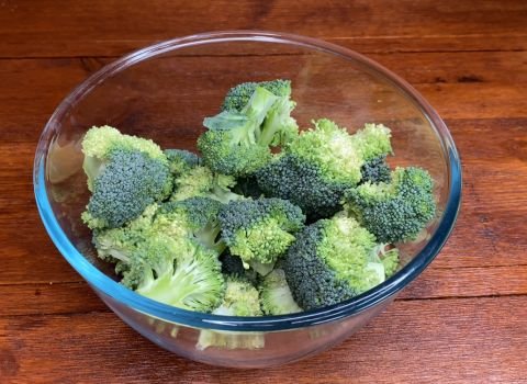 Start by washing the broccoli head under cool water. Cut the broccoli into florets. You want them to be bite-sized. Try to make them all about the same size so they cook evenly.