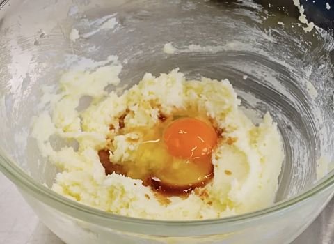 4. Add the egg and vanilla extract to the creamed butter and sugar. Beat on medium speed until smooth. Scrape down the sides of the bowl to mix evenly.