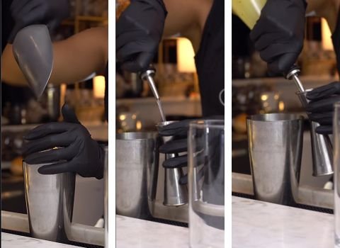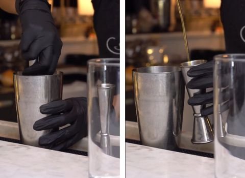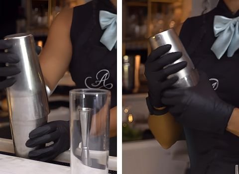 - Place the shaker top on the mixing tin. Hold it tight. Shake for a short time. The goal is to chill the drink and mix everything together. The tin should feel cold on your hands.