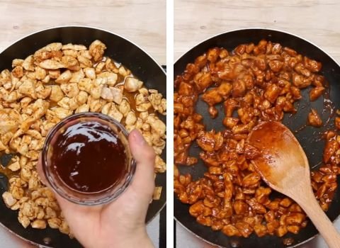 Pour in the barbecue sauce. Stir until all chicken pieces are covered. Let the sauce bubble and thicken for about five minutes. The sauce should reduce by half and cling to the chicken.