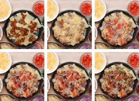 Add another layer of chips over the top. Repeat with the remaining chicken and toppings. This creates thick, hearty nachos with flavor in every bite.