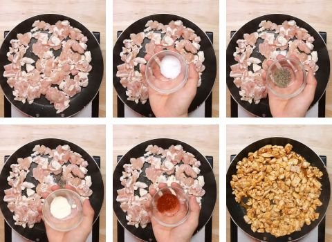 - Add diced chicken to the hot skillet. Sprinkle the salt, pepper, garlic powder, and chili powder over the chicken. Mix with a wooden spoon so every piece gets coated well. Cook for two to three minutes until the outside turns golden.