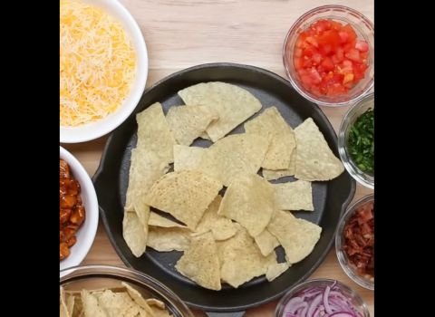 - Take your large oven-safe skillet or pan. Spread two large handfuls of tortilla chips in an even layer. Make sure the chips cover the surface so toppings do not fall through.